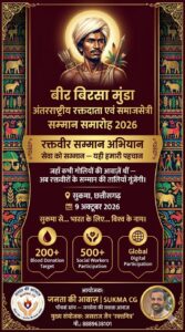 सुकमा। छत्तीसगढ़ के सुकमा जिले में आगामी 9 अक्टूबर को बीर बिरसा मुंडा अंतरराष्ट्रीय रक्तदाता एवं समाजसेवी सम्मान समारोह 2026 का आयोजन किया जाएगा। इस समारोह का उद्देश्य देशभर के स्वैच्छिक रक्तदाताओं और समाजसेवियों को सम्मानित करना तथा समाज में सेवा, समर्पण और मानवीय मूल्यों को बढ़ावा देना है।